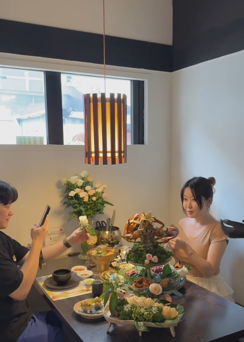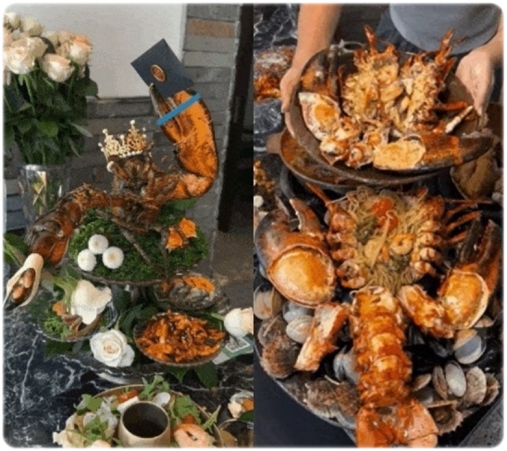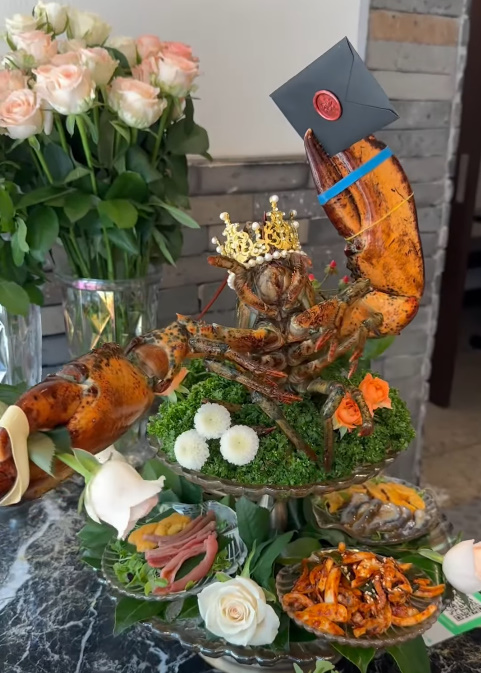 바로 랍스터의 특이한 모습 때문이었는데요, 이 랍스터는 이미 몸통이 절단된 상태로, 집게에는 편지와 꽃 한 송이를 들고 있는 모습이었습니다. 또한 머리에는 작은 왕관을 쓴 채로 테이블에 올려져 있었습니다.