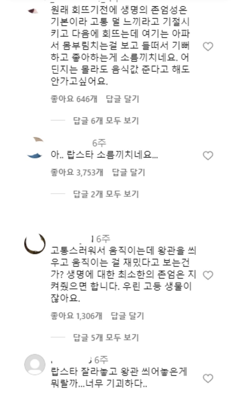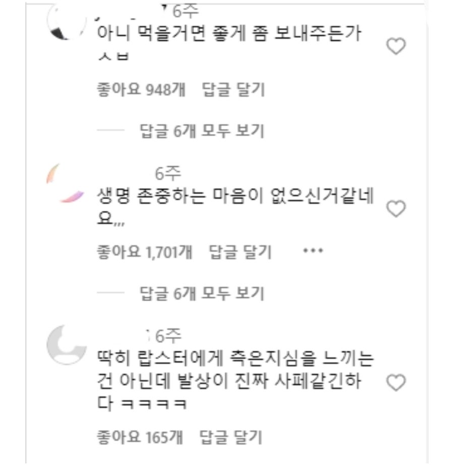 이후 그 랍스터는 버터구이로 조리되어 두 사람의 식사가 되었는데, 이 영상은 영호의 글과 함께 온라인상에서 빠르게 퍼져 나갔습니다. 그러나 이를 본 많은 네티즌들은 전혀 다른 생각을 했습니다. "생명에 대한 존중이 없다", "고통을 느끼며 죽어가는 동물을 보고 기뻐하는 모습이 소름 끼친다"는 반응이 이어졌죠. 특히나 몸통이 절단된 상태로 움직임을 보이는 랍스터에게 왕관을 씌우고, 집게에는 꽃과 편지를 든 모습은 기괴하다는 의견이 많았습니다.