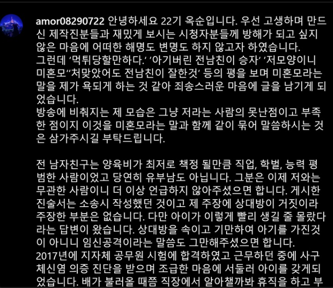 옥순 씨는 자신의 개인 채널을 통해 "먹튀당할 만하다", "아기 버린 전 남친이 승자", "저 모양이니 미혼모", "처맞았어도 전 남친이 잘한 것"이라는 악플을 접하며, 미혼모라는 단어가 자신을 욕되게 하는 것 같아 죄송스러운 마음에 글을 남기게 되었다고 밝혔습니다.