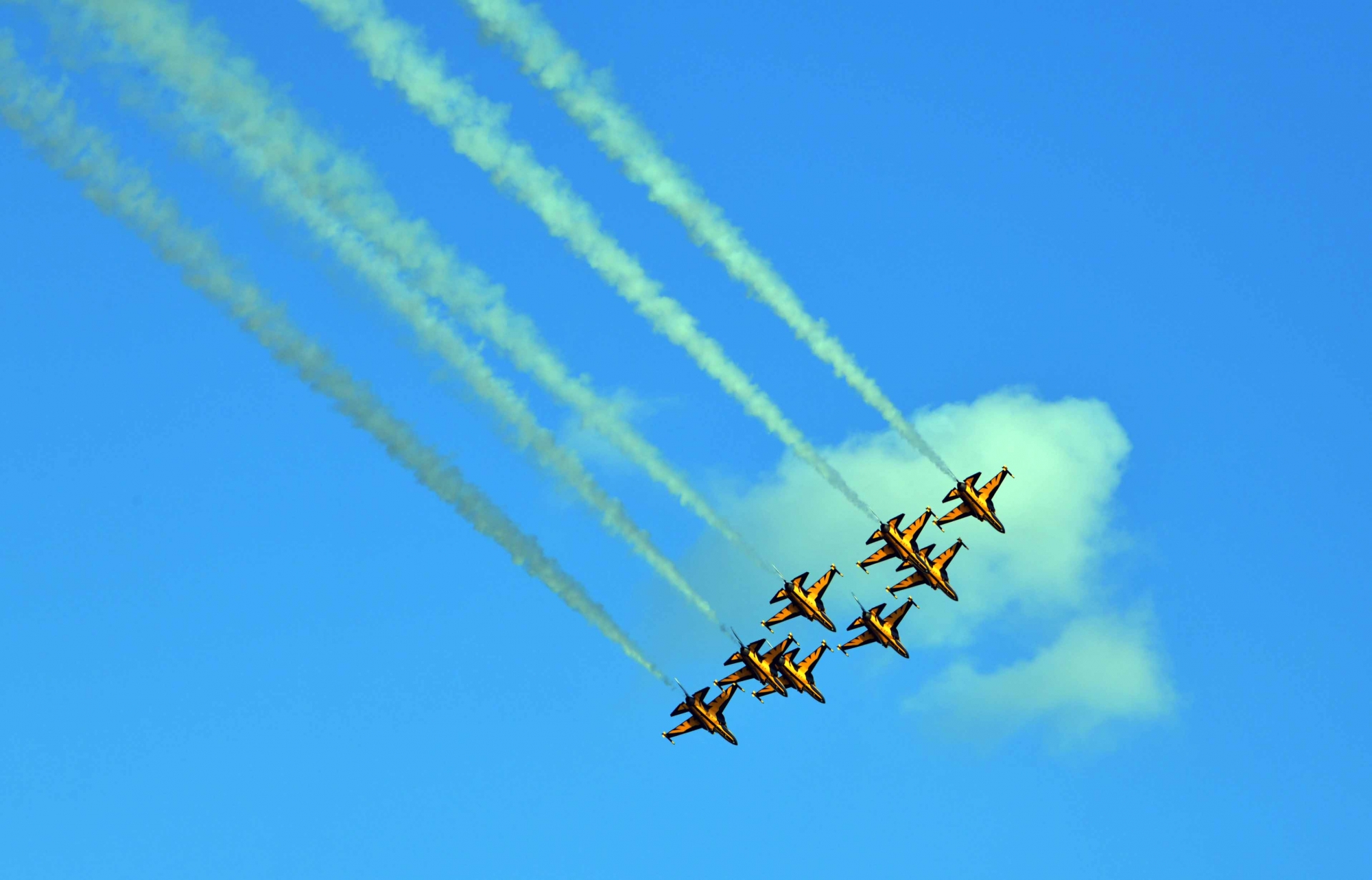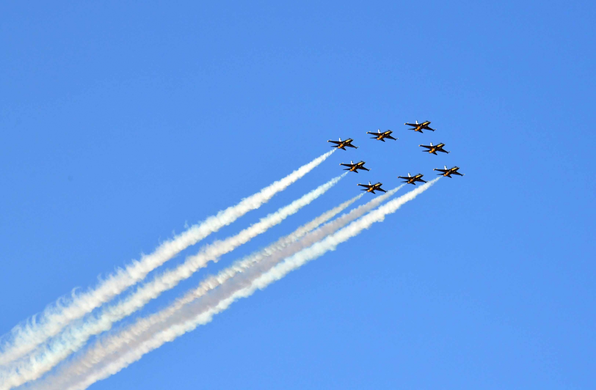 대한민국 공군의 특수비행팀인 블랙이글스는 8대의 T-50B 전투기로 하늘을 수놓으며 멋진 비행 시범을 선보입니다.