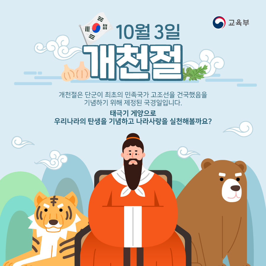 먼저, 다들 아시리라고 생각하지만 개천절은 어떤 날인지 알아보는 것이 좋겠죠? 개천절은 우리 민족의 첫 번째 국가인 고조선의 건국을 기념하는 국경일입니다. 단군이 기원전 2333년에 고조선을 세운 것을 기념하는 날로, '개천'이라는 말은 하늘을 연다는 뜻을 담고 있습니다. 이는 환웅이 태백산 신단수 아래로 내려온 날을 상징하며, 고조선의 건국을 의미합니다. 원래 음력 10월 3일이었지만, 이후 양력으로 변경되어 매년 10월 3일에 기념하고 있답니다.
