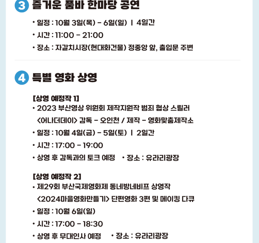이외에도 영화 상영회, 품바 공연 등 다양한 특별 프로그램도 놓치지 마세요! 특히 유라리광장에서 상영되는 영화와 감독과의 토크 시간은 영화팬들에게 특별한 시간을 선사할 거예요.