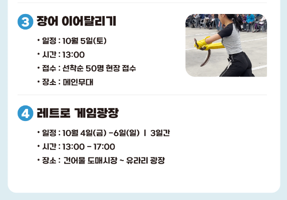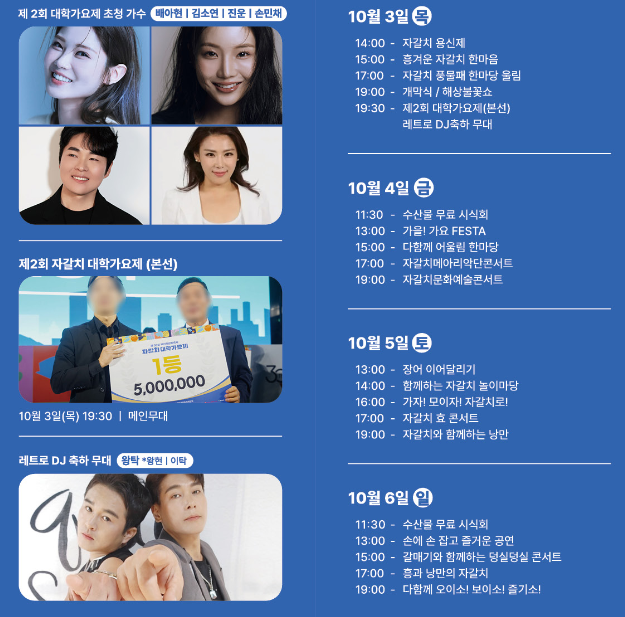 또한, 대학가요제, 가을 가요 페스티벌, 문화예술 콘서트 등 다양한 음악 공연도 마련되어 있어요. 특히 장어 이어달리기, 물고기 잡기 체험 같은 재미있는 이벤트들이 있어 남녀노소 모두 즐길 수 있답니다. 체험 프로그램은 현장에서 접수 가능하며, 참가비는 무료인 점도 매력적이에요.
