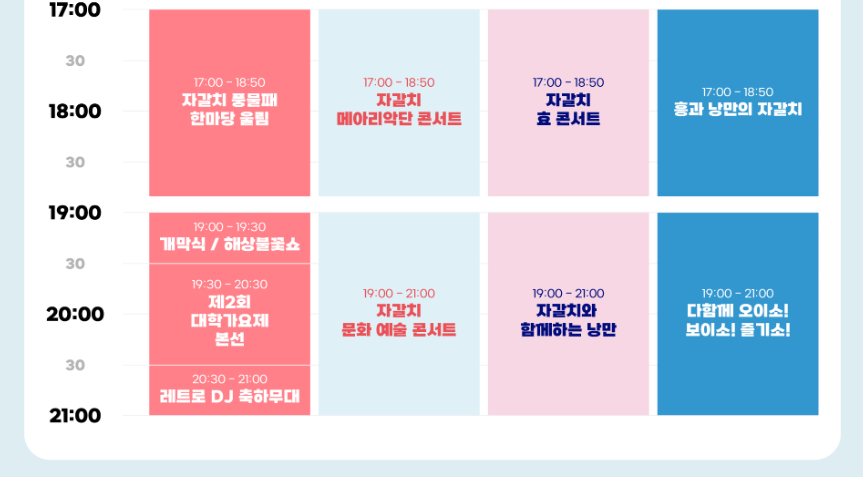 2024 부산 자갈치축제는 개막식이 열리는 10월 3일 오후 2시부터 시작해 밤 10시까지 이어집니다. 그 이후로는 10월 4일 금요일부터 10월 6일 일요일까지 낮 12시부터 밤 9시까지 다채로운 프로그램이 진행되는데요, 낮에는 수산물 시식회가, 저녁에는 화려한 공연들이 축제의 분위기를 한층 더 뜨겁게 달굴 예정이에요.