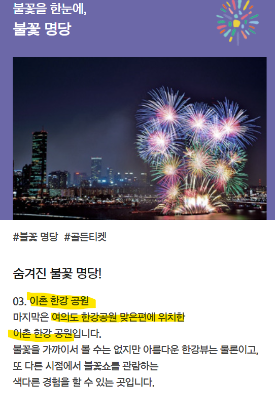 작년에도 가장 인기가 많았던 명당으로는 여의도 한강공원, 이촌한강공원, 한강대교 등이 있었습니다. 이들 명소는 올해도 많은 사람들이 찾을 것으로 예상됩니다. 이 외에도 노량진 사육신 역사공원이나 양화한강공원 같은 곳도 괜찮은 명소로 꼽히고 있으니 참고하시기 바랍니다. 하지만 어디를 가든 사람이 많을 것은 분명하니, 너무 명당 자리에 집착하지 말고 즐거운 마음으로 축제에 참여하시는 것을 추천드립니다.