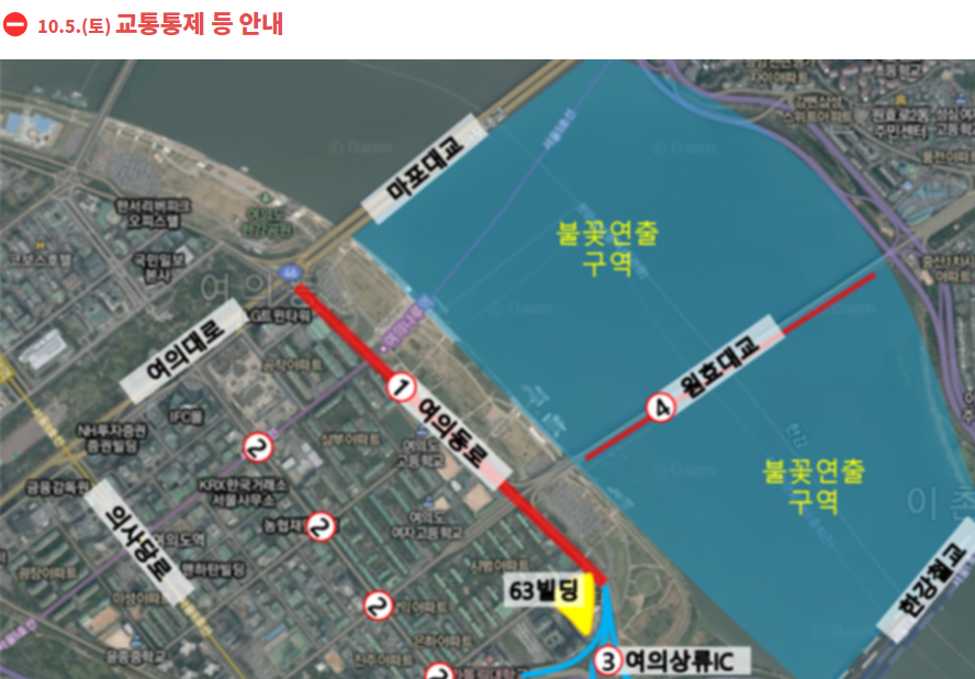 불꽃 축제 당일에는 여의도 일대가 매우 혼잡할 것으로 예상됩니다. 여의도 지역은 행사 당일 교통 통제가 이루어지기 때문에 차량으로 접근하는 것은 추천드리지 않습니다. 특히 원효대교와 여의동로 일대는 오후 2시부터 밤 10시까지 차량 통제가 이루어집니다. 따라서 이 시간대에 이 지역을 지나는 계획이 있으신 분들은 대중교통을 이용하시는 것이 좋습니다. 또한, 일부 버스는 우회 운행될 예정이니 대중교통 이용 시 참고하셔야 합니다.
