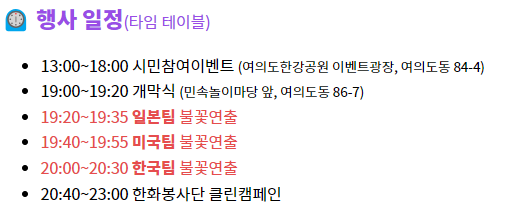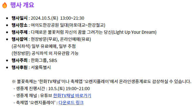 그러나 아직 공식 웹사이트에서 제공하는 세부적인 일정이 명확하지 않아, 방문을 계획하시는 분들은 세부 정보를 꼭 체크해두셔야 할 것입니다. 이번에 한강 여의도 공원이 메인 무대로 선정되었으며, 그곳에서 사전 공연 등 다양한 프로그램이 낮부터 운영될 예정입니다. 불꽃 축제를 즐기러 오시는 분들이라면 조금 일찍 도착해서 여유롭게 다양한 프로그램들을 즐겨보는 것도 좋은 방법입니다.