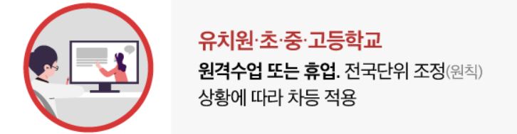 또한 유치원이나 초등학교 중학교 고등학교 같은 경우에는 원격수업이나 휴업을 하는식으로 운영이 되어서, 상황에따라서 자체적으로 차등적용하고 다르게 적용하는 부분이있을것으로 보이나, 원칙적으로는 코로나 3단계 조치에서 이러한 학교등과같은 시설은 휴업, 혹은 원격수업이 원칙이라고합니다.