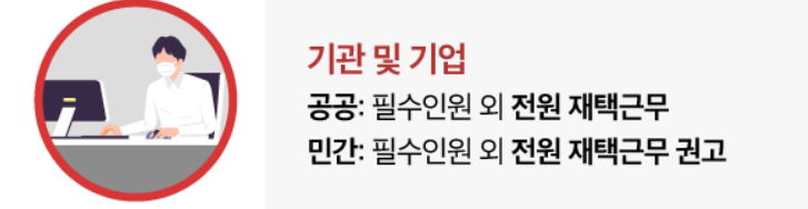 민간기업과같은 경우에는 기업에서의 판단에따라서 전원재택근무를 권고하여, 왠만한 기업에서는 재택근무로 전향을 하는것을 추진할것으로 보입니다.