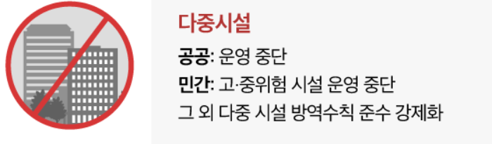 또한 다중시설과같은 경우는 공공시설과 같은경우는 운영이 중단되고, 민간시설같은 경우에도 거의 대부붖ㄴ 시설운영자체가 중단이 될수 있으나, 방역수칙을 강화하고 엄격하게 지킨후에 운영이되는곳도 있을것으로 보입니다.