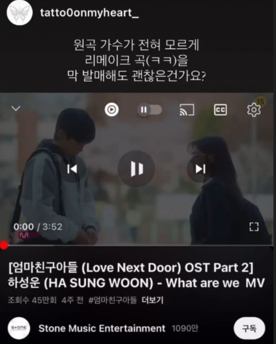 백예린의 인스타그램 스토리에 공개된 해당 OST는 '엄마친구아들'이라는 드라마의 주요 배경음악으로 쓰인 곡으로, 백예린은 이 곡의 특정 멜로디가 자신의 노래와 너무 유사하다고 느꼈습니다. 이에 대한 대응으로, 그녀는 하성운의 OST가 자신의 곡 '0310'과 비교되는 부분을 직접 편집해 영상으로 제작한 뒤 SNS에 공유하며, 해당 장면들을 공개했습니다. 이는 그녀가 이러한 표절 문제를 직접적으로 언급하면서 해당 이슈에 대해 적극적으로 대응하고 있다는 신호로 해석될 수 있습니다.