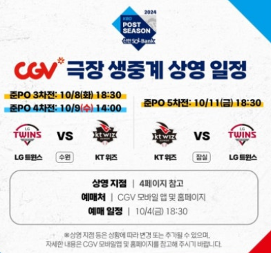 이번 준플레이오프를 조금 특별하게 즐기고 싶으시다면, 영화관에서 야구를 관람하는 것도 좋은 방법이에요. CGV에서 준플레이오프부터 플레이오프, 그리고 한국시리즈까지 모든 경기를 생중계합니다. 극장의 쾌적한 환경에서 큰 스크린으로 경기를 관람하면서 그 짜릿한 순간들을 만끽할 수 있는 기회니까요. 티켓 예매 못 하셨더라도, CGV에서 편안하게 관람하실 수 있습니다.