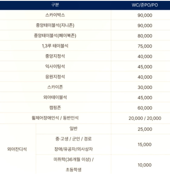 준플레이오프 티켓 가격은 좌석에 따라 다릅니다. 잠실 야구장의 프리미엄석과 중앙 VIP석은 13만 원으로 가장 비싼 자리이고, 테이블석은 9만 원, 익사이팅존은 7만 원으로 가격이 책정되었습니다. 반면에 레드지정석은 5만 원, 네이비지정석은 4만 5천 원으로 비교적 저렴한 편입니다. 장애인석의 경우 블루휠체어 장애인석은 2만 원, 동반인석은 3만 2천 5백 원입니다.