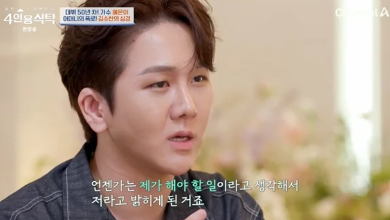 김수찬은 ‘4인용 식탁’에서 처음으로 이 가족사에 대해 자세히 언급했습니다. 그는 “어머니가 방송에 나간다는 사실을 방송 전날에야 알았다”며, 어머니가 자신보다 더 큰 피해를 입지 않을까 걱정했다고 말했어요. 어머니가 전 남편의 만행을 폭로한 것에 대해 김수찬은 자신이 앞으로 더 이상 이런 일로 흔들리지 않겠다는 의연한 태도를 보이며 용기를 내어 이야기를 털어놓았답니다.