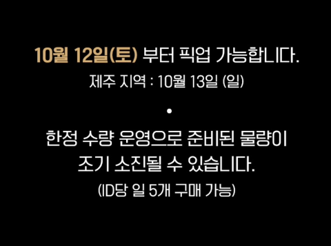 저도 포켓CU 앱에 접속해봤는데 이미 솔드아웃이더라고요. 새벽 0시에 접속해도 1분 만에 매진될 만큼 그 인기가 엄청난 것 같아요. 가격은 4,900원으로, 1인당 5개까지 구매 제한이 있어요. 예약 후 10월 12일 오후 2시 이후 CU 매장에서 픽업하실 수 있답니다.
