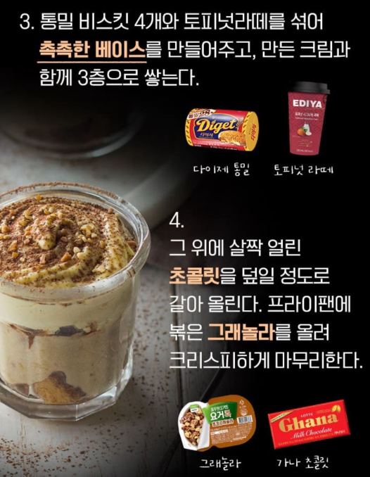 나폴리 맛피아 님이 사용한 재료들은 모두 CU 편의점에서 쉽게 구할 수 있는 것들이었어요. ‘연세우유 마롱 생크림빵’과 ‘헤이루 맛밤’을 활용해 크림을 만들어 티라미수를 완성했죠. 빵 속 생크림을 휘핑해 크림으로 쓰고, 밤을 갈아 넣어 만든 이 디저트는 다이제스티브 과자와 그래놀라까지 얹어 바삭한 식감까지 살렸어요. 날씨가 쌀쌀해지면서 밤 라떼가 생각나는 계절에, 이 ‘밤 티라미수’는 정말 딱 어울리는 디저트가 아닐까요?