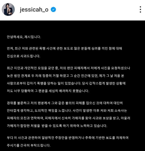 그런데, 11일 저녁 제시가 연루된 사건이 발생했습니다. 제시는 일행과 함께 모임을 가지고 있었는데, 지나가던 팬이 제시에게 다가와 사진을 요청하는 사건이 발생했습니다. 문제는 이 팬이 사진을 요청했을 때 일어난 일입니다. 사건의 피해자는 제시의 오랜 팬으로, 우연히 골목에서 그녀를 발견하고 용기를 내어 다가가 사진을 요청했다고 합니다. 그러나 제시의 일행 중 한 남성이 이를 막으며 영어로 욕설을 퍼부었다고 합니다. 제시는 이 상황을 만류하며 "죄송하지만 사진을 찍어줄 수 없다"는 말을 전했습니다.