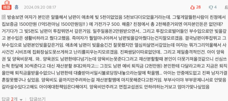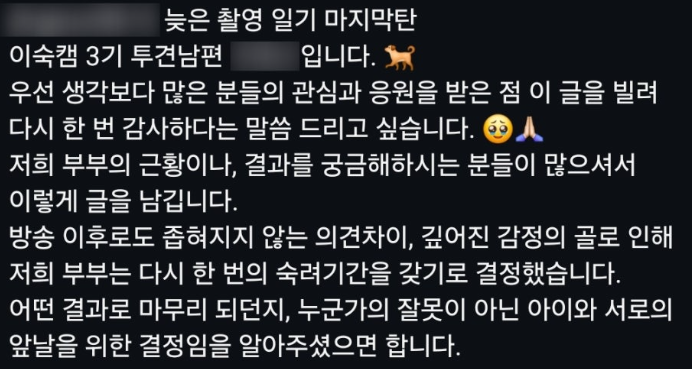 그녀는 또한 "캠프를 통해 많은 것을 돌아보고 마지막이라는 생각으로 관계를 개선하려 했지만, 방송에서는 다 보여지지 않았던 더 깊은 갈등이 존재했다"며, 이를 해결하기 위해 법률대리인을 선임해 이혼 절차를 진행하게 되었다고 밝혔습니다. 이러한 글은 그녀가 결혼 생활에서 겪었던 감정적인 고통과 해결되지 않은 갈등을 여실히 드러냈습니다.