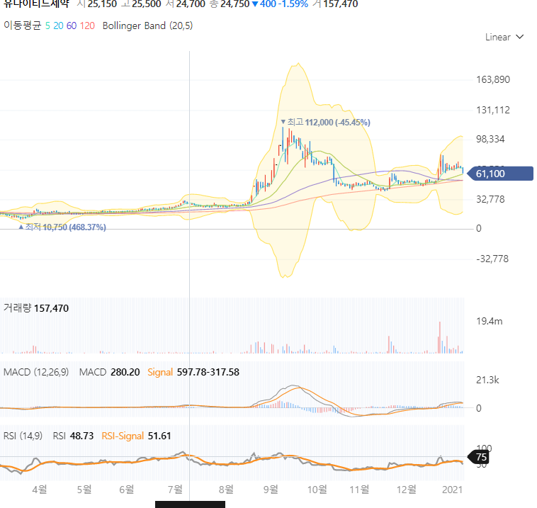 차트상으로는 볼린저밴드가 상당히 벌어졌으나, 여러 차트지표들로는 확실하지않은 추세입니다. 모든것이 불확실하며, 만약 좋은 호재나 악재가 나오거든 어떻게든 변화가 보여질것으로 보입니다. 다만, 12월24일부터 1월7일동안 일정수준을 유지하려는것같은 횡보가 이어졌기때문에, 한번 집중해서 낙폭을 보셔서 진입등을 고려해보시는것도 좋은 방법이되지않을까싶습니다. 개인적인의견으로는 두세달 가량을 보았을때, 현재 과열된 주가시장에 따라가는것이아니라, 호재나 악재에 따라서 강하게 가는 힘이 있을것으로 보이는 주식으로 나쁘지않을 것같은 유나이티드제약입니다. 하지만 정말 상황이 좋지않다면, 5만원대 라인까지 빠졌다가 다시 상승하는 추세를 보여주는 식으로 될수도있기에 분석해보시고 확신이 선다싶으면 진입하시는것을 추천드립니다.