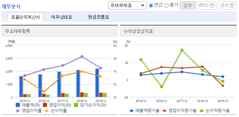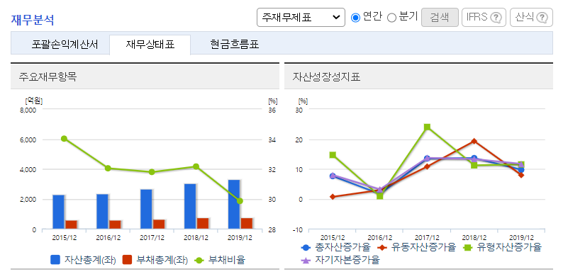 위와같으며, 단순하게 연도별 포괄손익계산서 기준으로, 순이익률과 매출액의 상태는 나쁘지않아보입니다. 물론, 2019년도 12월에 당기순이익과 영업이익률이이 주춤하였으나, 이는 재무상태표에서 참고하실수있듯이, 부채의 비율을 급감시켜서 부채비율을 줄여, 자산에 대한 안정성을 확보하려는 시도로 보입니다. 물론 주제넘게 확실치 않은 이야기일수있으나, 자산이 상승하는 과정에서 부채비율을 감소시키는 과정은 필요하다고 생각됩니다.