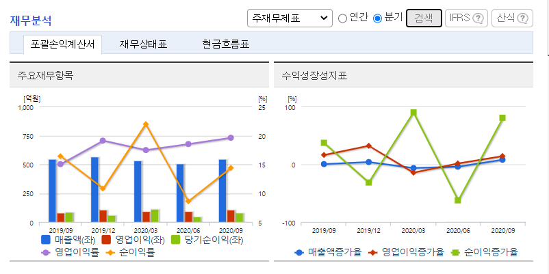 위의 그래프에서 오른쪽그래프를 보시게되면 오른쪽은 같은 포괄손익계산서이지만, 분기별입니다. 즉, 분기별 포관손익실적이 영업이익이 점차 우상향으로 상승하는 모양새를보아, 의약품 관련 테마주 다른 관련주들처럼 상당히 심각하고 엉망인 재무제표상태를 보여주고있지는 않은 모양입니다. 이것에 대해서 언급하는 이유는 요즘 테마주로 급등하고 급락하는 의약품, 제약관련주들중에서 재무제표 살펴보시면 정말 엉망으로 한번도 흑자낸적없는 회사도 허다합니다. 떄문에 이런점은 나중에 급락하여 -20~30% 비율이 난다고 하더라도 다시 회복가능성을 보여주는 지표중에 하나이지않을까싶습니다. 다만, 더 좋았으면 좋겠지만 요즘 유행하는 테마주나 실체가 확실치않은 말도안되는 재무제표와 현금상태를 보여주는 주들은 정말 내려가면 다신돌아오지않을수도있습니다.