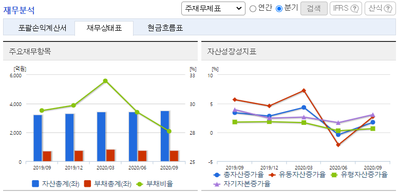 재무상태표도 마찬가지로 분기별로 보시게 되면, 자산총계는 늘어나지만, 부채비율이 급감하는것을 보실수있습니다. 때문에 자기자본증가율은 약간씩증가하고,유동자산은 변동폭을 보여주게됩니다.
