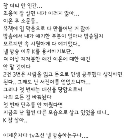 이상아는 인스타그램에서 "참 더티한 인간"이라는 표현을 사용하며, 그동안 자신에게 씌워진 오해에 대해 강한 불만을 표시했습니다. 이상아의 이번 폭로는 첫 번째 남편 김한석에 대한 것이며, 그녀가 방송을 통해 어떤 이야기를 할지 많은 이들의 관심이 집중되고 있습니다. 이상아는 더 이상 이혼에 대해 지저분한 이야기는 하고 싶지 않다고 밝히며, 이번 방송에서 마지막으로 모든 진실을 털어놓을 것임을 예고했습니다.