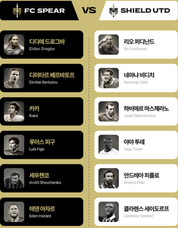 FC 스피어 팀은 전 세계에서 이름을 떨친 최고의 공격수들로 구성되었습니다. 디디에 드로그바, 카카, 루이스 피구, 안드리 셰브첸코, 델 피에로, 에덴 아자르 등 축구계를 빛낸 스타들이 한 팀을 이루고 있습니다. 또한, 한국의 축구 레전드 안정환, 이천수도 이 팀의 일원으로 참여합니다.