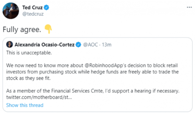 극좌파로도 불리는 Alexandria Ocasio Cortez의 로빈후드에서 매수버튼을 막아버린건 말도안된다..이건 청문회가 필요하고 헤지펀드는 문제가 있다는 발언을 하였고, 이에 대해서 극우파라고도 불리는 보수 하원의원인 Ted Cruz가 완전히 동의한다고 글을 올렸습니다.