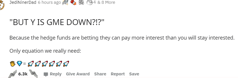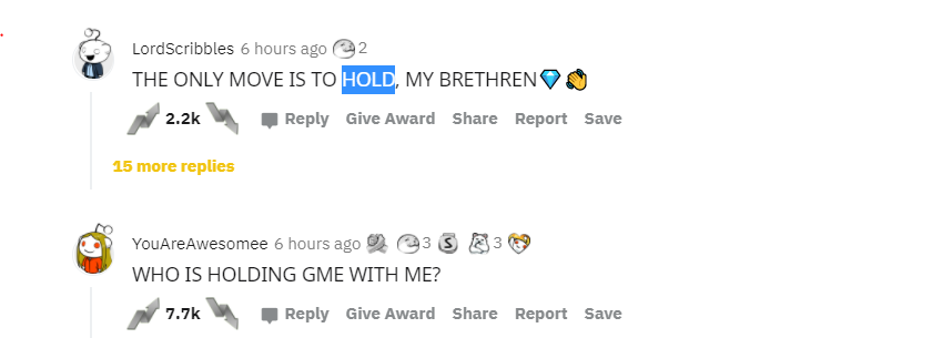 실제로 이말은 레딧 월스트리트배트 페이지에 가장많이나오던 말중에 하나였습니다. 지금도 마찬가지로 많이 나오고 있지만, 이는 많은 미국 개인투자자들을 응집하게 하고, 실제로 당장 매도하면 엄청난 수익이있음에도 불구하고 많은 이들을 홀딩하게 만들었습니다.