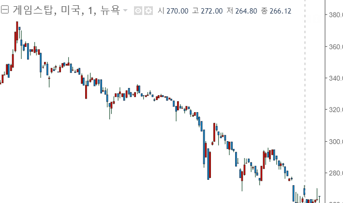 차트를 보게되면 이를 적나라하게 볼수있으며, 차트를 모르는 사람만 봐도 이렇게 떨어질수있나 싶을 정도입니다. 하루만에 거의 400불가까이 까지 오르던 게임스탑 주가는 최저점으로 거의 반토막이 나버렸고, 계속 어딘가에서 매수가 들어올법하면 찍어눌러내리는 모양새를 볼수있습니다. 일방적으로 폭행하고 나갔다고 해도 무방할정도로 보이며, 이는 많은 이들의 분노를 다시금 사게되었습니다.