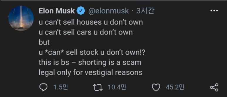 여기에 테슬라의 엘론 머스크도 평소에 공매도는 사기다라고 외치며 싫어하던 찰나에, 트위터에