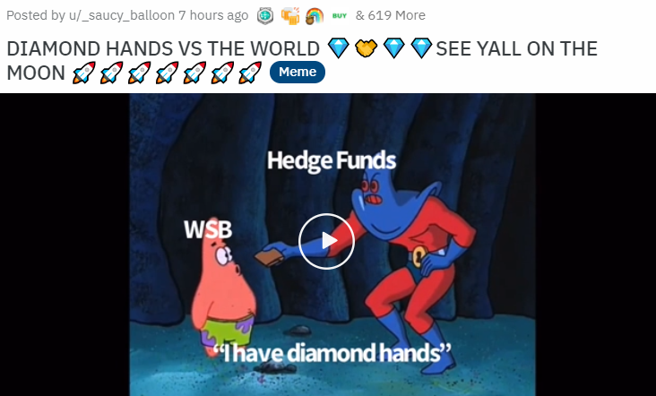 이런식으로 취향과 관심사에따른 추천 혹은 TOP서브레딧들이 나옵니다. 제가 요즘 들어가고 구경하는 서브레딧은 월스트리트배트 입니다. 단연 공매도 사건뿐만이 아니라 요즘 은값 상승과 게임스탑 공매도 세력과 싸운것, 그리고 그 가공할만한 자본력과 자본력보다 뛰어난 단합력이 멋있어서 들어가봅니다. 우리나라와 관련된 서브레딧들도 있습니다. 그런데 요즘에는 이 월스트리트배트 서브 레딧에 흥미가 생겨서 들어가보고있습니다. 아래와 같이 다이아몬드 핸드(안파는 무조건홀딩!)을 밈으로 만든것도 있습니다. 400%의 수익을 보여줘도, 당장팔면 400만달러를 벌어도, 절대 팔지 않고, 전열을 가다듬는 모습이 너무나도 멋있고 나라면 가능했을까하는 존경심마저 들었습니다.