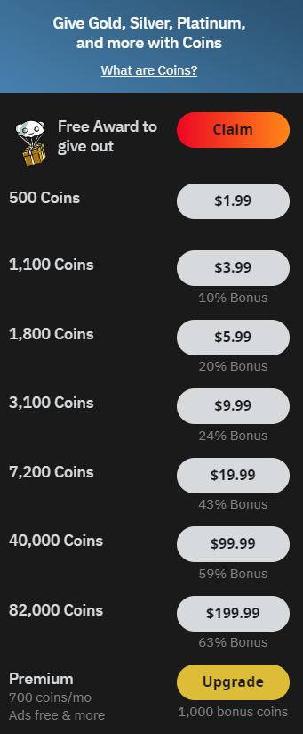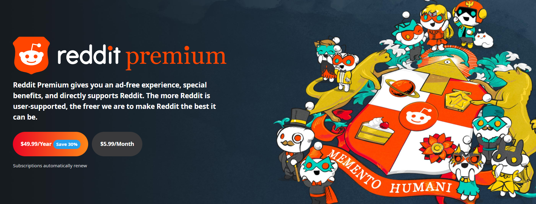 이는 레딧 프리미엄 이용권으로 월단위나 연단위로 구매를 하는것이 가능합니다. 보통 레딧을 많이 이용하는 사람들이 레딧의 편한 이용을 위하거나, 레딧을 이용할때 뭔가 특전을 바라는 분들에게 추천되는데, 웹페이지 스킨을 변경하거나 광고를 제거하거나 프리미엄 전용유저 서브 래딧등과같은 다양한 편의성과 특전들이 있다고합니다.