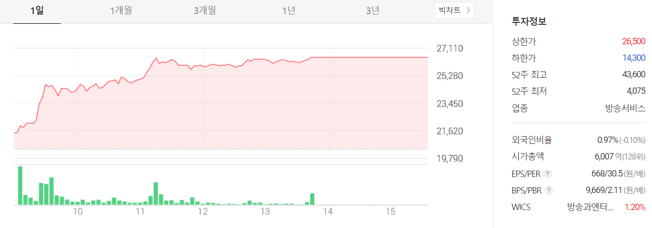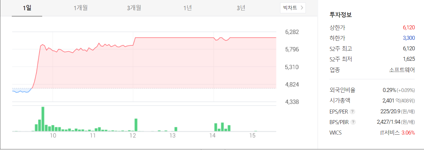 갤럭시아머니트리와비슷하게 전자결제 관련주로 꼽히기도 하고, 쿠팡과 관련된 호재로 인해서 상한가를 기록했습니다.