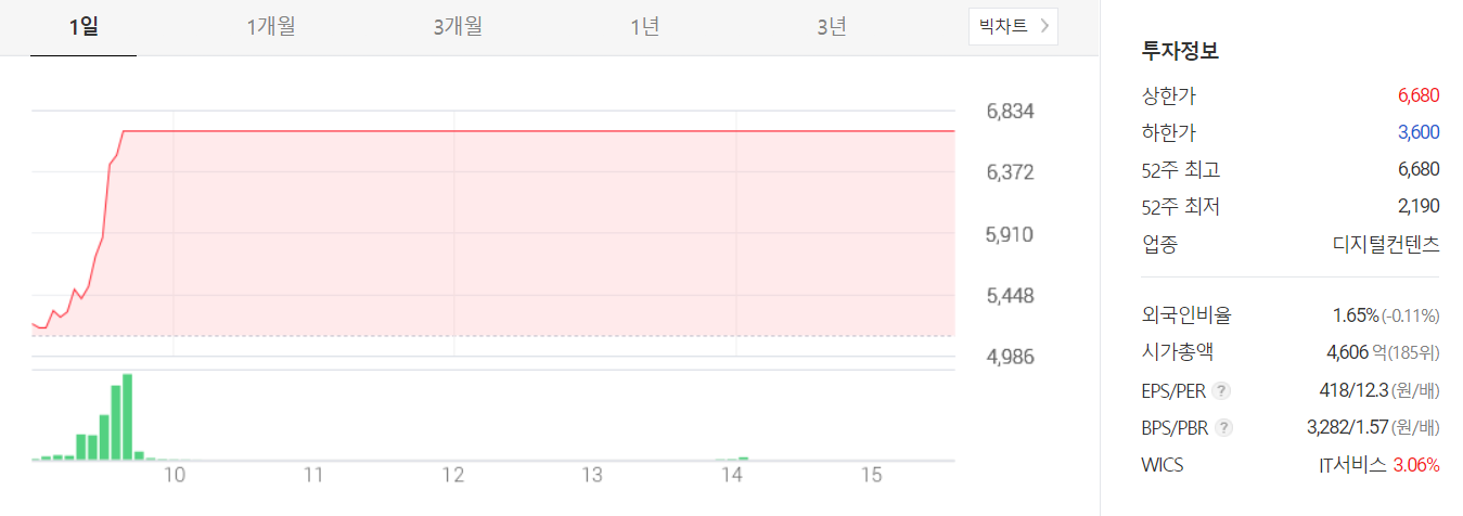 3가지 호재로 인한 상한가를 기록했습니다. 1. 무상증자 2.골프장과같은 자산 매각 3,복잡한 지배구조 개선과 앰앤씨글로벌과의 합병 소식입니다.