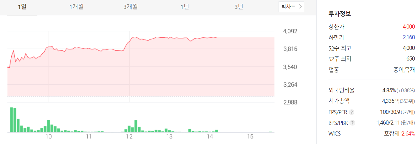 대영포장은 쿠팡이 나스닥에 상장한다는 기대감과 골판지 제조 테마가 겹쳐서 상승하는 국면을 맞아 상한가를 기록했습니다. 쿠팡관련주로 쿠팡 테마에 골판지 테마까지 겹쳐서 상한가를 기록한것으로 보입니다.