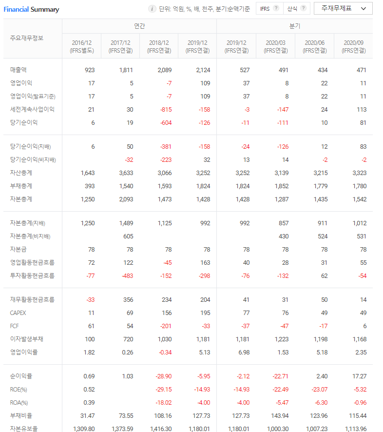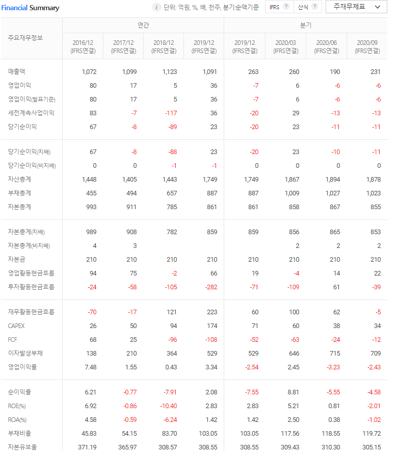 재무제표를 보시게 되면, 자기자본이익률 ROE는 좋지 않은 편이지만, 순이익률이 3, 4분기에개선되는 모습을 볼수있습니다. 또한 매출액은 19년도보다 개선될 가능성을 보이며, 당기순이익은 19년도 대비 개선될 여지를 보여주고있습니다.