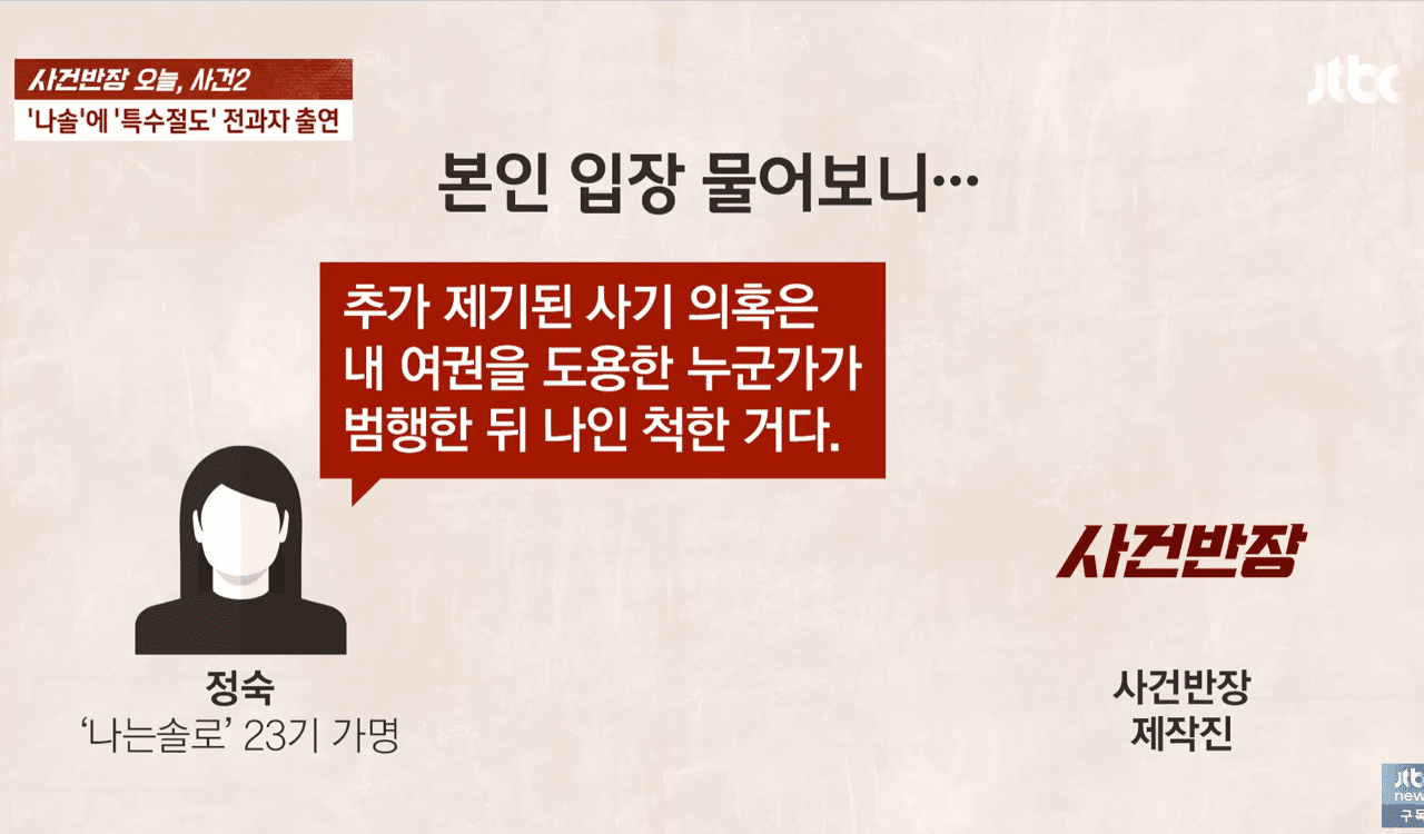 특히 이번 의혹은 단순한 사생활 문제가 아니라 범죄 연루와 관련된 내용이어서 충격을 더했습니다. 이에 대해 정숙은 강력하게 혐의를 부인하며 반박했습니다. JTBC ‘사건반장’에서 그녀와의 인터뷰를 통해 입장을 전하며, “형법상 죄를 저질러 남에게 피해를 준 적이 없다”라는 입장을 밝혔습니다.
