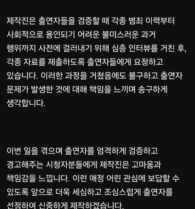 제작진은 출연자 선정 시 사회적으로 용인되기 어려운 과거 행위에 대해 철저한 검증 절차를 거친다고 밝히며, 출연자들에게 범죄 기록 등 각종 자료 제출을 요구해 심층 인터뷰를 통해 확인한다고 덧붙였습니다.