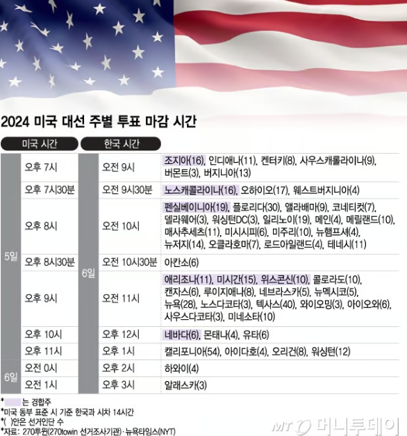 투표는 미국 동부 지역부터 시작해 서부와 알래스카 순으로 진행되며, 주요 경합주의 투표 결과는 한국 시간으로 11월 6일 오전 9시부터 순차적으로 발표됩니다. 네바다주의 투표 종료는 낮 12시로 예상되며, 출구 조사와 초반 개표 결과는 오후 8시부터 확인할 수 있을 것으로 보입니다.
