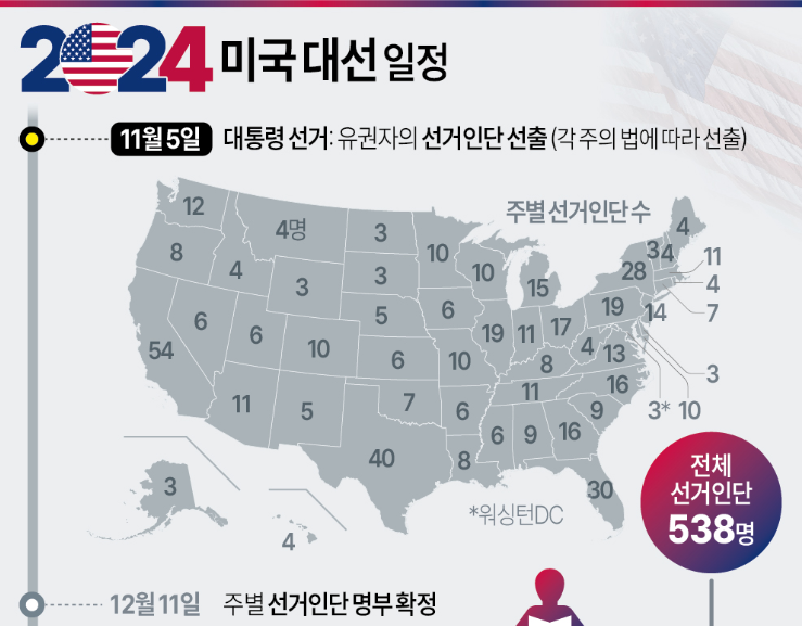 미국 대선은 선거인단 제도를 통해 간접적으로 대통령을 선출하는 방식입니다. 각 주의 유권자가 선거인단을 뽑고, 선출된 선거인단이 최종적으로 대통령을 선출하는 구조입니다. 총 538명의 선거인단 중 과반수인 270명을 확보한 후보가 당선됩니다.