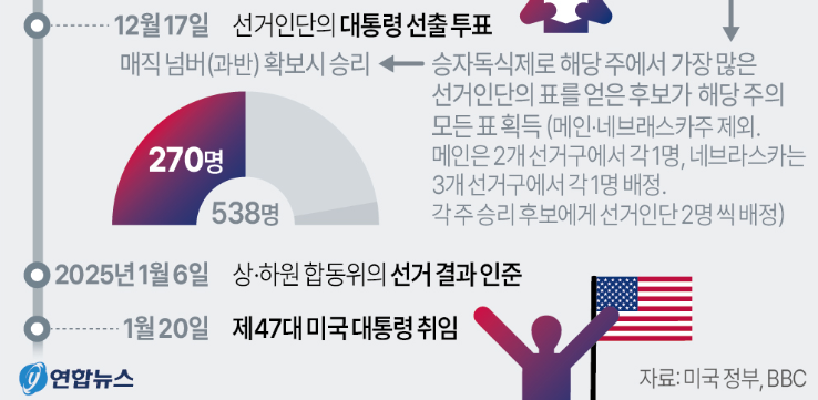 미국 대선은 투표가 끝난 이후에도 여러 절차를 거칩니다. 11월 5일 투표가 종료되면 각 주에서는 12월 초까지 선거인단 명부를 확정하며, 12월 16일 선거인단이 최종 투표를 진행합니다.