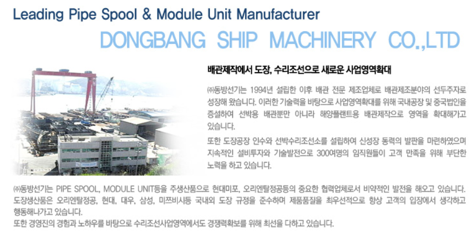 동방선기는 1994년도에 설립된 이후로 배관 전문 제조 업체로 배관 제조분야에서 상당히 주목받는 선두주자로 성장해온 기업입니다. 동방선기가 가지고 있는 기술력으로 사업확대 및 영업확장을 시도하여 국내뿐만아니라 중국법인까지 증설하여서 선박 배관 및 해양플랜트 배관제작등까지 영역이 확대되고있다고 합니다.