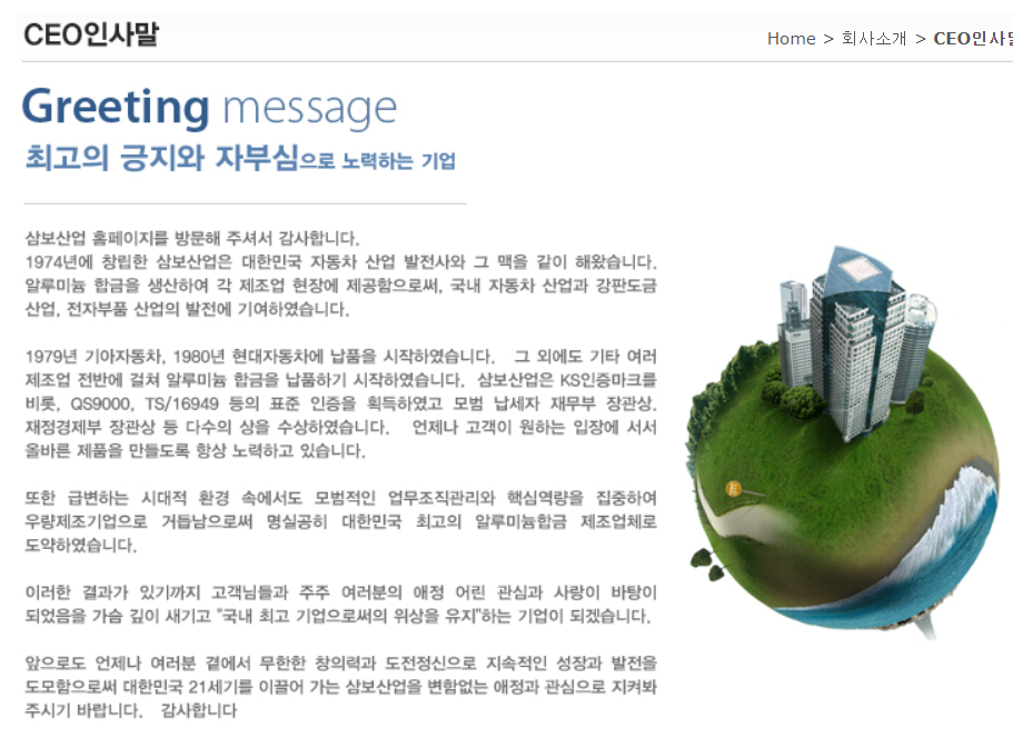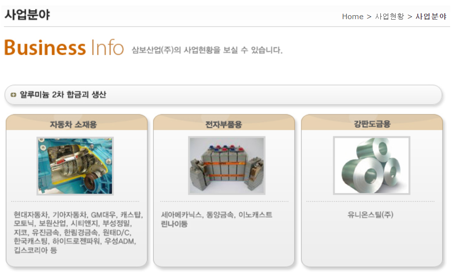 삼보산업은 알루미늄 합금의 제조와 판매업을 목적으로 만들어져, 현재 알루미늄 합금산업과 재활용산업에 임하고있습니다. 그리고 이러한 철제제품들을 재활용 및 재용해를 하여 합금제품으로 만들어서 대부분 자동차 부품소재용으로 사용한다고 합니다.
