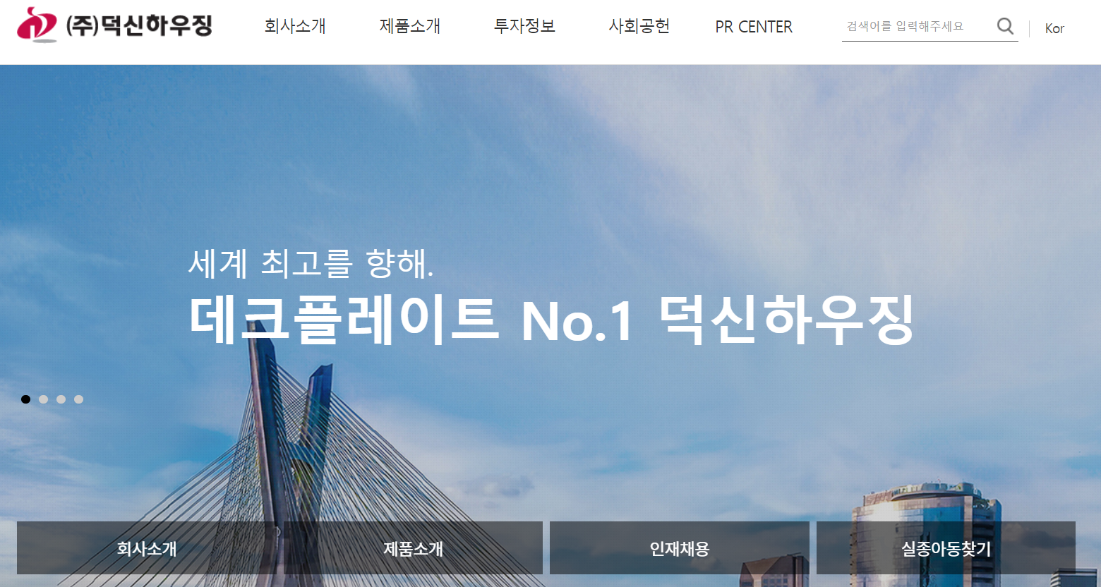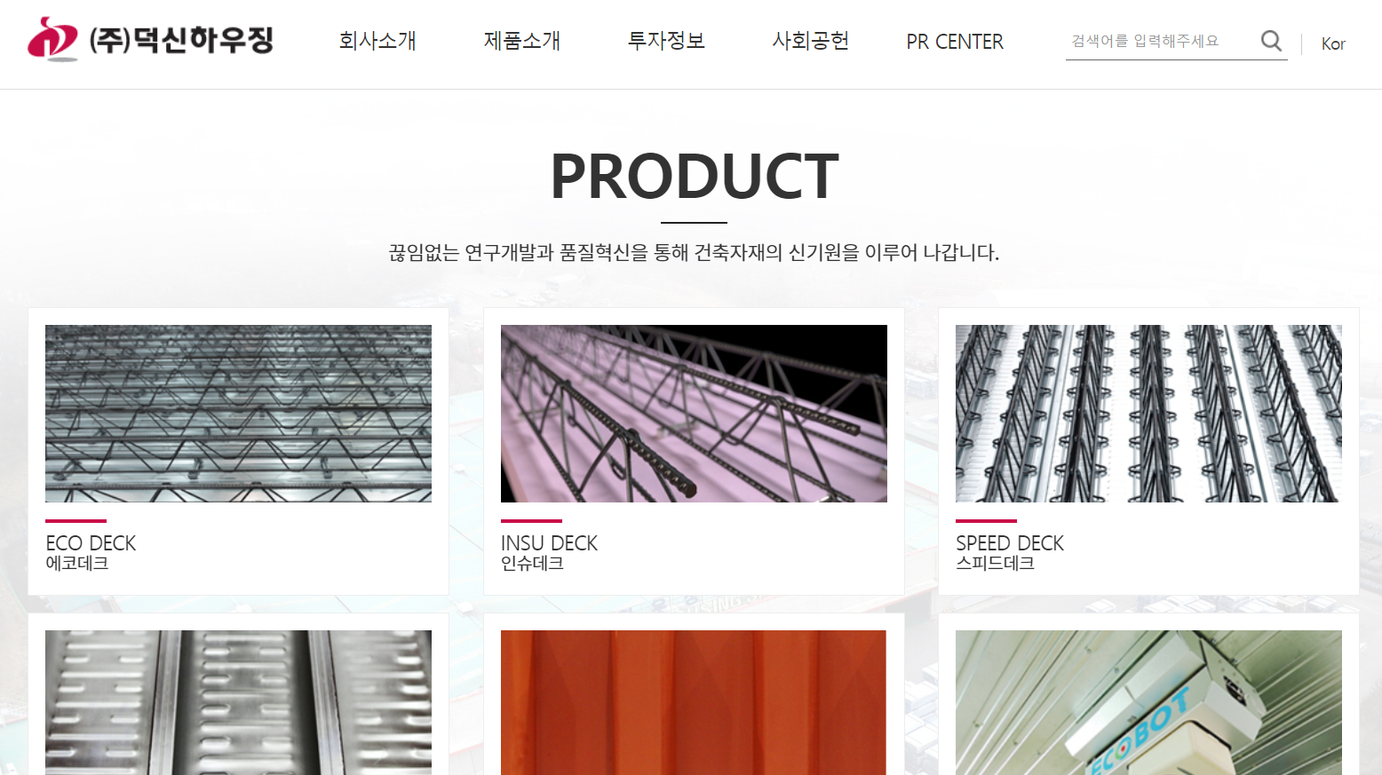 위는 덕신하우징의 홈페이지 화면입니다. 사실 투자를 하시기 전에 어떤 회사인지 감을 잡기 위해서 홈페이지 첫화면만보고도 알수있는데, 이러한 에코데크, 홈데크, 스피드데크,인슈데크, 이노데크 에코봇과같은 다양한 생산라인으로 건축자재의 신기술들에 집중하고 있습니다.