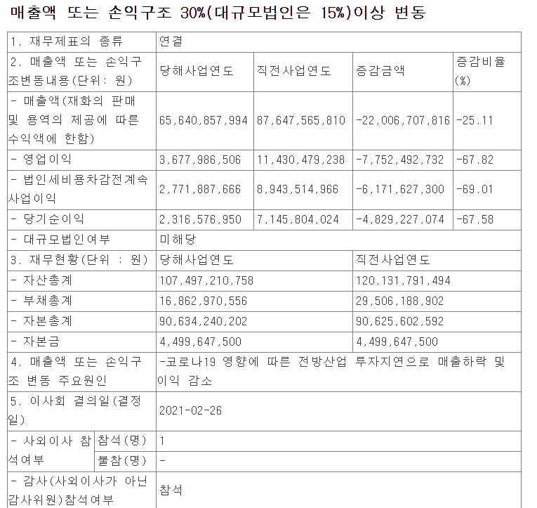 선익시스템은 위와같이 말씀드린바와같이 코로나19로인하여 매출이하락하고 이익이 감소한형태를 보여, 사실상 매출추이로만 본다면 상당히 위험하고 위태로운 상황이었다고 생각됩니다. 영업이익 및 당기순이익이 거의 70%가량 하락했다는 사실은 상당히 절망적이라고 보입니다.