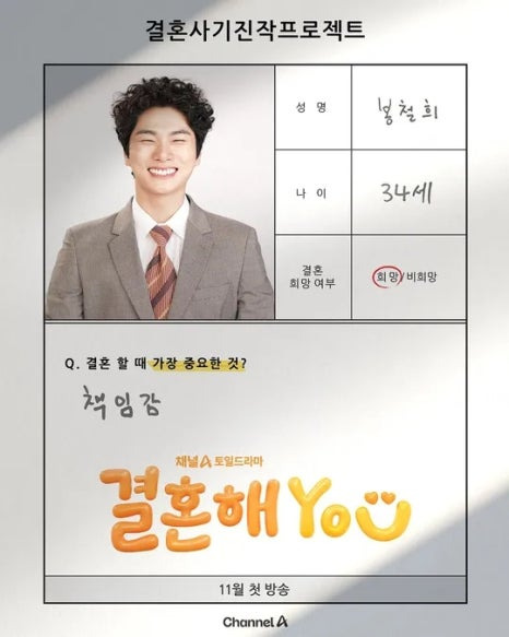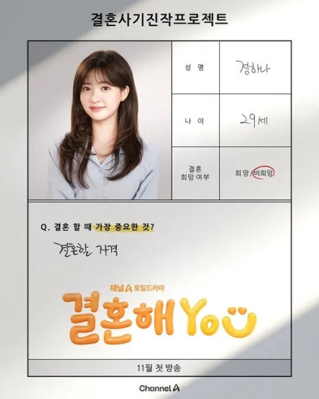 11월에 방영을 시작하는 <결혼해YOU>는 결혼과 비혼이라는 현대인의 고민을 유쾌하고 따뜻하게 풀어낸 로맨틱 코미디로, 벌써부터 흥미로운 설정과 매력적인 캐릭터들로 주목받고 있답니다.