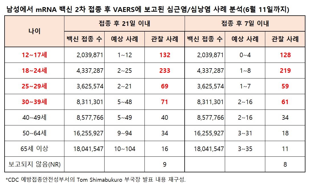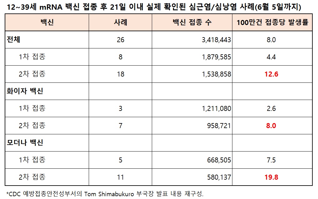 미국질병통제예방센터(CDC)에서는 mRNA 기반인 화이자·모더나 코로나19 백신 접종자에서 심근염/심낭염이 드물게 보고됐다고 6월 23일(현지시각기준) 해당 사항에 대하여 예방접종자문위원회(ACIP) 회의에서 밝혔다고합니다.