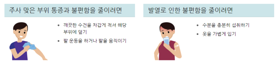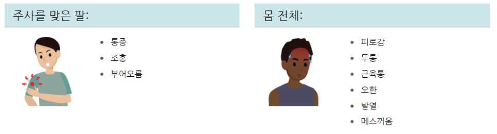 주사를 맞은 팔에는 통증 / 부어오름 / 붉게 변할 수 있는 가능성이 있다고 합니다.